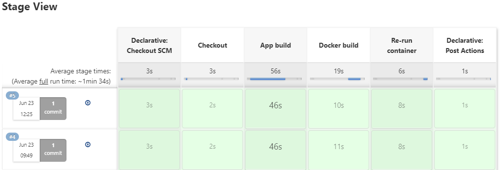 다음 사진은 Jenkins 데시보드에서 제공하는 Pipeline Stage View이다. Spring Boot 애플리케이션의 소스코드를 가져오고 빌드 및 배포까지 하는 과정을 소요된 시간별로 시각화하여 보여준다.