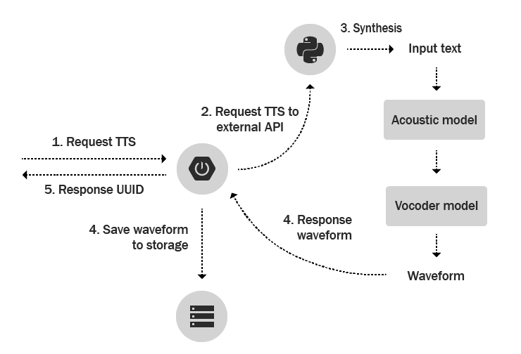사용자가 유틸리티 서버에 TTS를 요청하면 해당 서버는 TTS 합성을 담당하는 Python 서버에 요청한다. 해당 서버는 유틸리티 서버에서 받은 Text를 Acoustic, Vocoder 모델을 거쳐 음성 Waveform 파일을 합성한 다음 다시 유틸리티 서버로 전달한다.